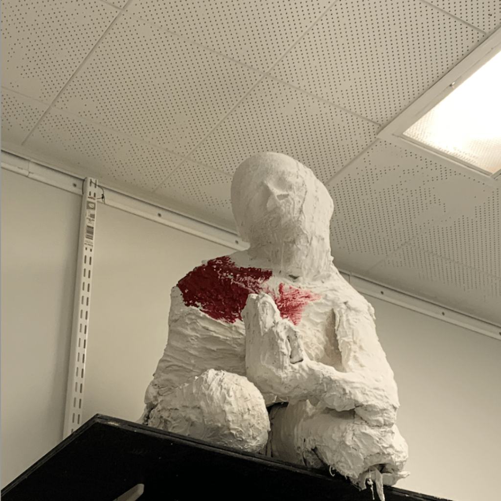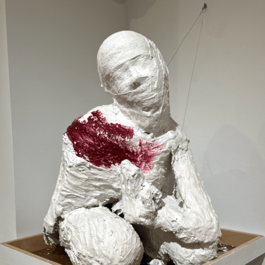This sculpture represents the reincarnation of Saint Christina the Astonishing, a woman who died of an epileptic seizure, but during the funeral service levitated up to the rafters. Using plaster, the sculpture explores gestures of jerks, jolts, starts, and stops, asking for both grace and tension, mourning and happiness, fluidity and brokenness, life and death. The sculpture moves with the artist’s own body, bringing it from Christina, who lived in 12th century Belgium, to Maria, who lives in 21st century New York City. Through their epileptic gestures, prayer, and the possibility of blank spaces, Maria, epileptic and unwell artist, and Christina, Saint of epilepsy and mental illness maybe come together, cripping time, space, worlds. Christina was shown as part of an Advanced Studio Works show in Macy Gallery at Teachers College, Columbia University in Spring of 2024.